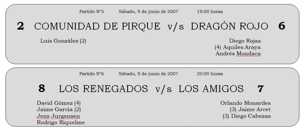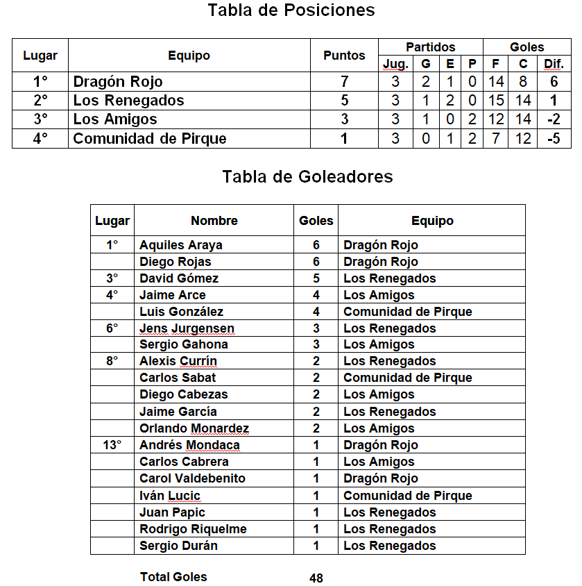 En el primer partido, el equipo Dragón Rojo demostró por qué es el puntero al golear a Comunidad de Pirque por seis goles a dos con una destacada participación de Aquiles Araya quien anotó cuatro goles para su equipo. Comunidad de Pïrque, nunca encontró su juego, ya que el esquema que planteó su entrenador para el partido no resultó.