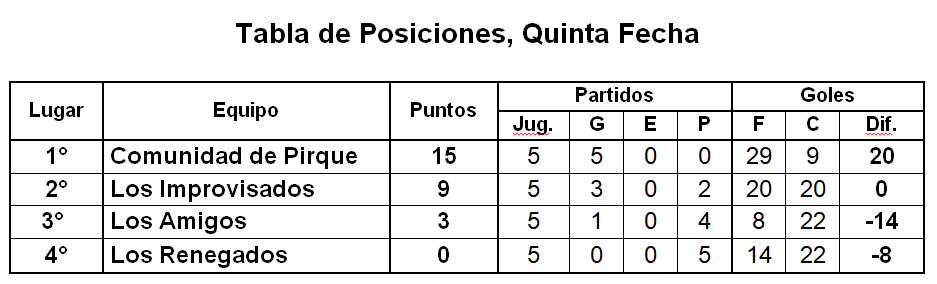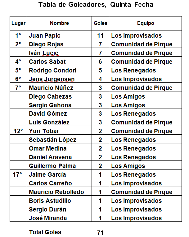 Es importante destacar, que también recibieron un premio especial (medalla de oro) el Goleador del Campeonato Juan Papic, del equipo Los Improvisados, quien logró convertir once goles y a David Contreras, del equipo Comunidad de Pirque, por haber obtenido la valla menos batida. Las estadísticas definitivas del campeonato, como la tabla de posiciones y de goleadores se muestran a continuación.